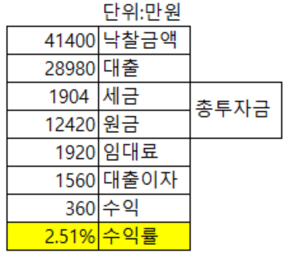 대출은 70% 그리고 대출이자는 원리금균등상환으로, 세금은 4.6%. 총투자금이 대충 1억 5천은 있어야겠네요. 근데 수익률은 2.51% 이걸로 만족할 수 있을까요? 낙찰자는 분명 낙찰받고 세를 160에서 200으로 올리겠죠. 비싸게 사고 그 비용을 임차인에게 돌려주는 게 우리나라 부동산 메커니즘이니까요. 안타깝죠. 세입자가 이 자리가 괜찮았다면 배당요구를 안 하고 입찰을 했을 수도 있겠다는 생각을 해봅니다. 단순히 몰라서 안 들어갔을 수도 있고요.