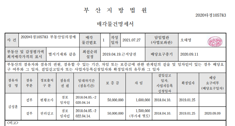 매각 명세서를 보니 160만원 정도의 임대수입이 가능한 자리인데요. 권리분석을 할 것도 없는 게 임차인은 선순위 임차인이고 배당요구를 했으니 신경 쓸 것은 X. 그럼 이 낙찰자는 얼마 정도의 수익률을 가져갈 수 있을까요? 계산 때려봅니다.