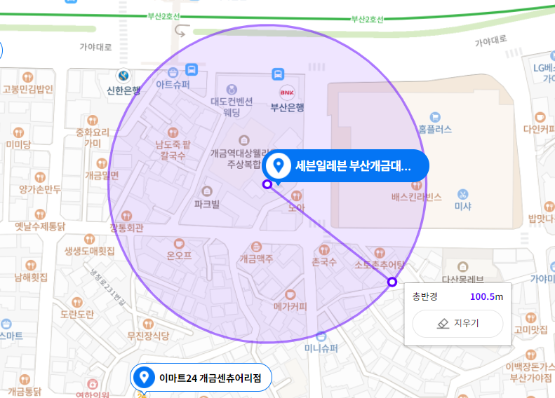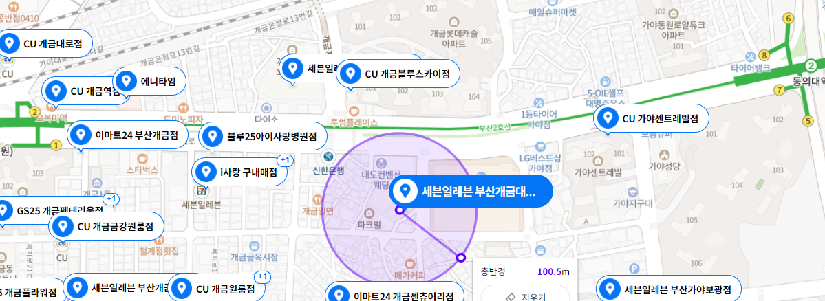 그럼 수익분석 한번 해볼까요? 우선 자리부터 살펴보죠. 네이버 지도에서 웬만한 정보는 다 얻을 수 있습니다. 동의대역과 개금역 사이에 위치하고 있네요. 편의점 왜 이리 많니~ 좀 더 줌인해볼게요.