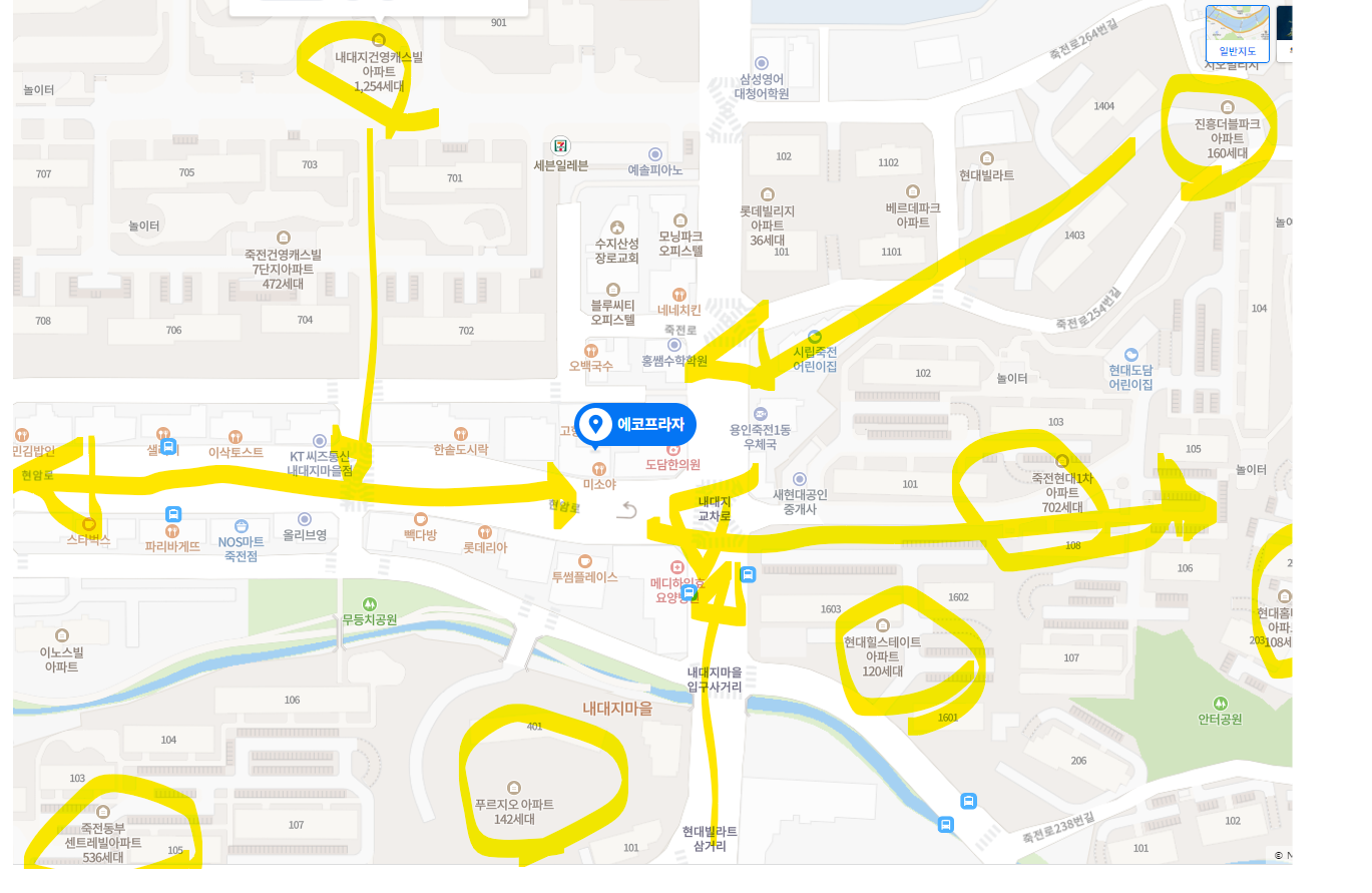 동서남북에 아파드들이 마치 성처럼 상가들을 에워싸고 있는 모습이에요.