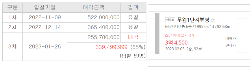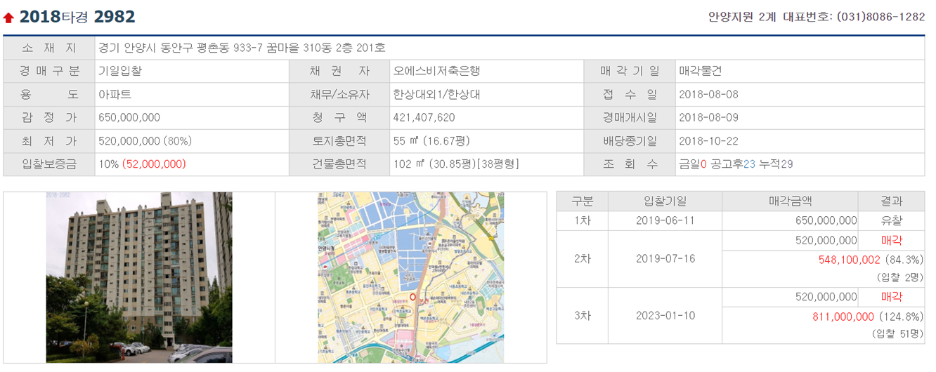 경쟁도 경쟁이지만 경쟁으로 인해 올라간 낙찰가는 호가나 실거래가에 비해 '전혀' 메리트가 없어요. 최종적으로 낙찰 후 2달에서 3달 걸리는 긴 과정을 포함하면 굳이 왜 경매를 해야 하는지 이해가 안 됩니다. 안양물건은 2억정도 차이가 있지만 낙찰된 물건은 2층(저층)입니다.