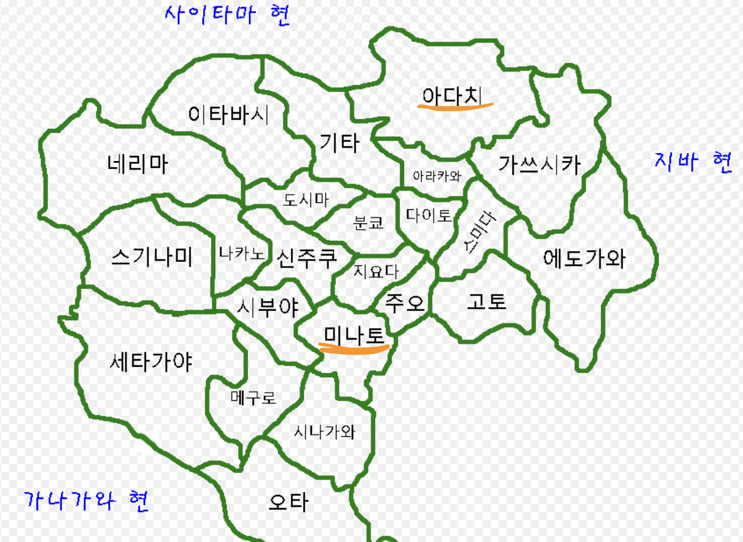 제가 이 책을 도서관에 우연히 보고 빌리게 된 결정적 계기가 된 구절이에요. 데이터는 참 흥미롭습니다. 아리카와 가즈히사님이 데이터가 좋더라고요. 일본의 수도권 도쿄 23구를 아래 지도로 보시면 미나토구는 핫플레이스죠. 주변에 일본을 몰라도 한 번쯤 들어본 지역명들이 있죠. 반면에 아다치 구는 듣보잡이에요. 작가의 말을 빌리자면 안정을 추구하는 일본의 여성들은 도쿄의 핵심부로 몰리고 남성들은 변두리로 나가고 있다고 합니다. 그래서 결론적으로 미나토구 여자는 아다치구 남자를 만날 가능성이 매우 희박하다 할 수 있어요.