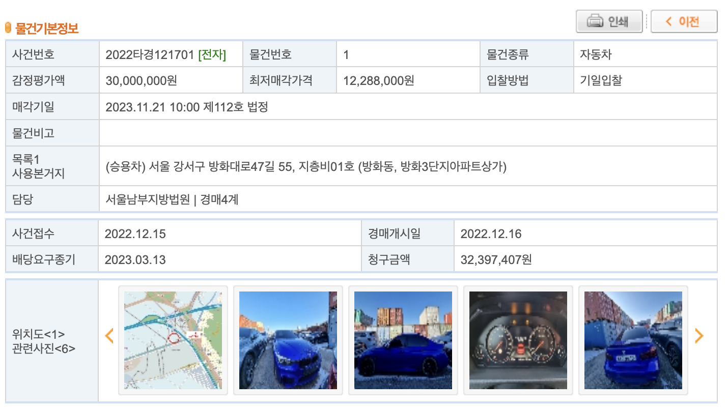 오늘은 '대법원'차량경매에서 흥미로운 차량을 발견해서 포스팅해 봅니다. 제가 사는 곳에서 가까운 곳에 차량이 보관되어 있어서 직접 임장 아니니 '차장'을 하고 왔습니다. 카히스토리까지 보니까 이런 차가 과연 누가 얼마에 사서 뭘 할 것인지가 너무 궁금한 거예요. 그래서 내일 21일 입찰가능한 BMW 330i 차량에 대한 내용 공유해 보도록 하겠습니다.