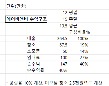 그래서 순수익률은 무려 40%입니다. 만약 임대료를 낮게 받고 소모품도 절약할 수 있었다면 수익률은 더 늘어났겠죠.