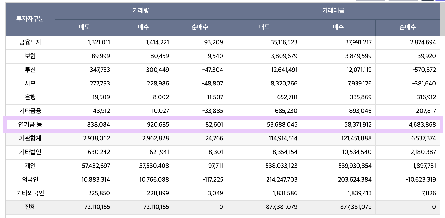 그럼 내년까지 투자금액은 24.2억원이 된다. 위의 기준금액은 9월 기준이니 이미 2달이 넘어 3달째가 다 되어가는 12월이라 연기금이 좀 더 국내주식을 BUY 했다는 그럴듯한 추측을 할 수 있다. 그리고 그 추축은 데이터로 찾아볼 수 있다. 아래 데이터는 10월부터 12월 17일까지의 기록이고 추측은 맞았다. 4.6조 원어치 주식을 순 BUY 했다.