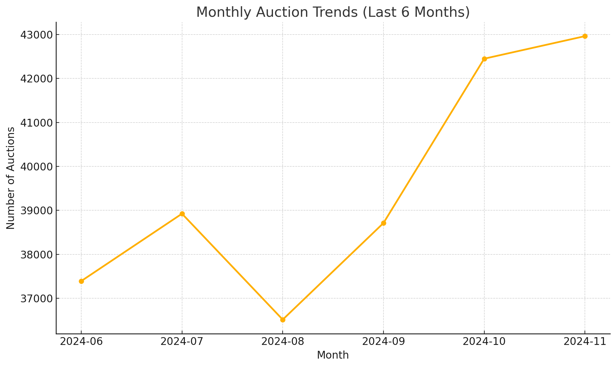 위 그래프는 최근 6개월 동안의 월별 경매 건수 추이를 보여줍니다. 경매 건수는 지속적으로 증가하는 경향을 보이며, 특히 10월과 11월에 정점에 도달했습니다. 이러한 데이터는 현재 경매 시장이 활발하게 움직이고 있음을 시사합니다.