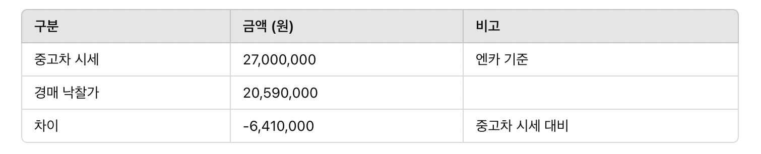 제가 여러 번 강조드렸던 대법원자동차경매의 룰이 잘 적용이 된 것 같은데요. 대법원 경매에서 성공적으로 낙찰받기 위해선, 입찰가를 중고차 시세 대비 500만 원 이상 낮게 책정하는 것이 효과적입니다. 이번 낙찰자는 이 룰을 잘 활용해 경쟁에서 이겼다고 볼 수 있습니다. 일단, 룰을 설명하기에 앞서 중고차시세를 다시 한번 소환하도록 하겠습니다. 중고차시세에서 500만 원 정도 낮춘 가격이 적정가격이 될 수 있다 말씀드렸는데요. 이번 매물은 중고차시세와 700만 원 정도 차이가 납니다. 주황색은 개성이 뚜렷하지만 시장에서는 다소 비인기 색상으로 분류됩니다. 흰색이나 검은색 차량보다 수요가 낮아, 경매 가격이 상대적으로 저렴하게 형성되는 경향이 있습니다.
