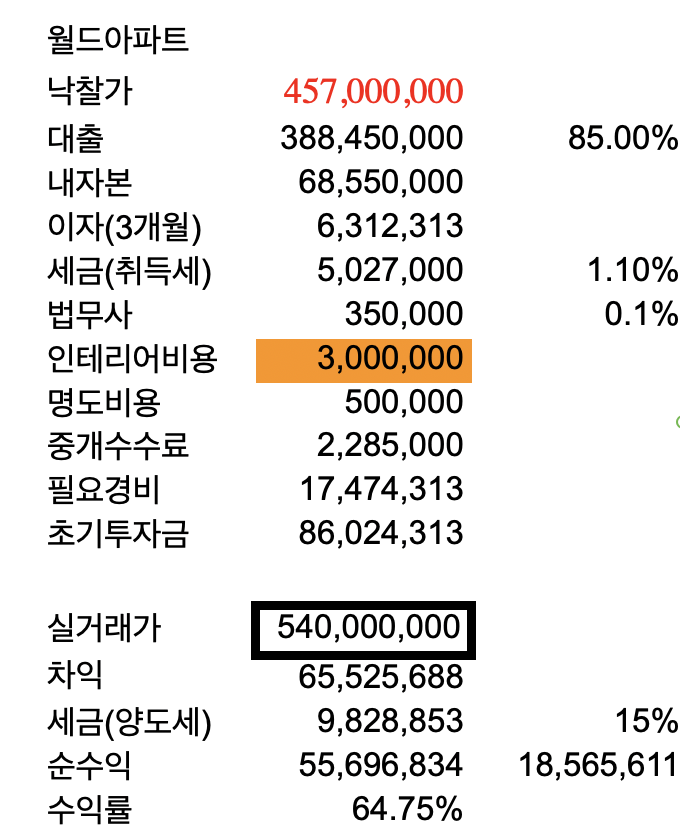 그럼 맥스로 5.4억 정도에 판다고 했을 때 얻을 수 있는 순이익 예상치를 보겠습니다. 대략 얼마 정도 종잣돈이 있어야 투자가능한 매물인지도 함 보시죠. 경매수익자동계산기 돌려보겠습니다.